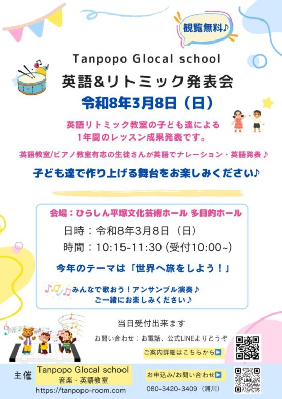 今年は令和8年3月8日(日)「英語&リトミック発表会」を開催いたします!
